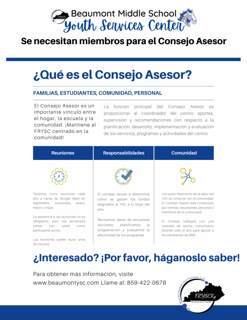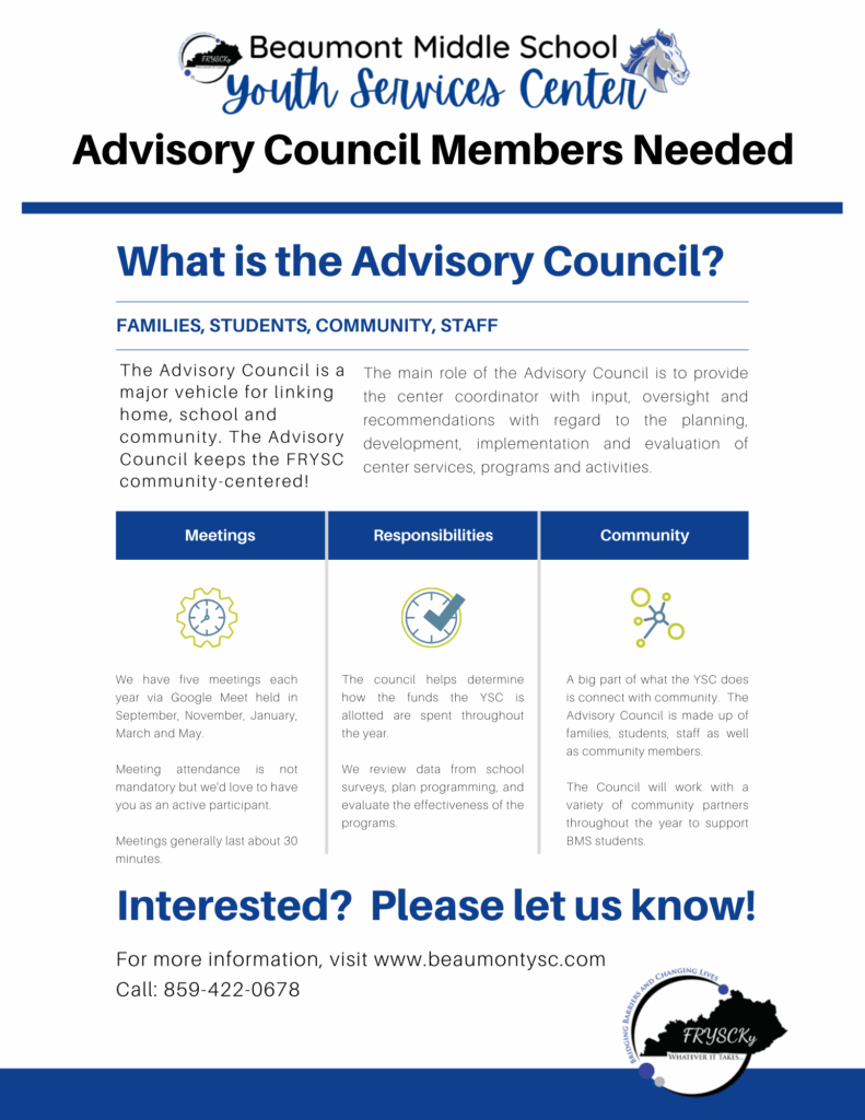 We are currently seeking new members for the 2025-2026 school year. Once the council positions are filled for the year families, community members, staff and students are invited to attend any meetings. Contact Betsy Fusilier if you would like more information. 859-422-0678 or complete the online BMS contact form.