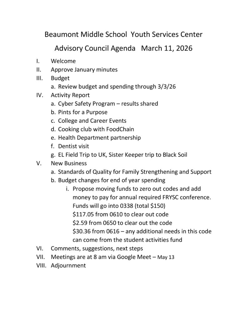 We are currently seeking new members for the 2025-2026 school year. Once the council positions are filled for the year families, community members, staff and students are invited to attend any meetings. Contact Betsy Fusilier if you would like more information. 859-422-0678 or complete the online BMS contact form.