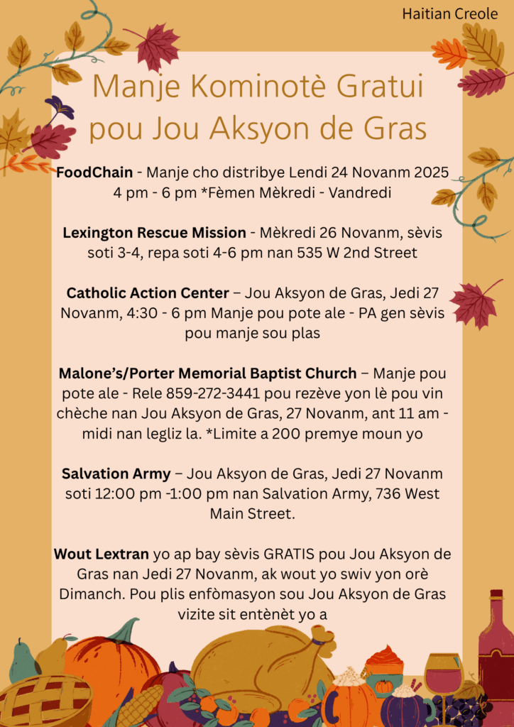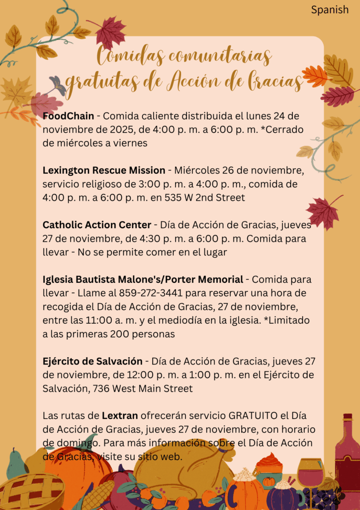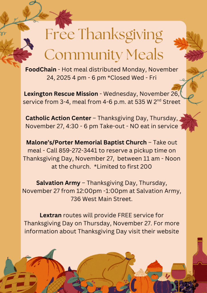Malone’s/Porter Memorial Baptist Church – Take out meal – Call 859-272-3441 to reserve a pickup time on Thanksgiving, November 27, 2025 between 11 am – 12:15 pm at the church. Registration will max at 200 families.
