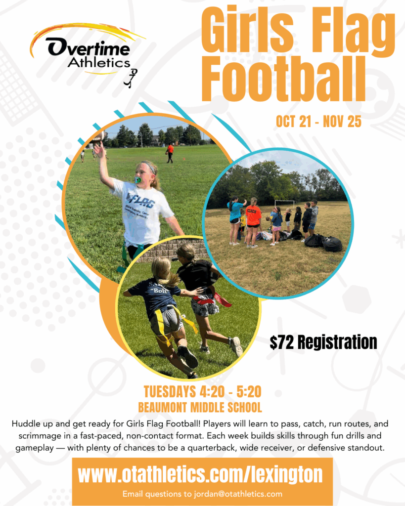 ⚽Girls Flag Football (Grades 6–8) – Join OTA for an exciting new after-school program at Beaumont Middle! Students will learn passing, catching, running routes, and play fun scrimmages in a fast-paced, non-contact format.