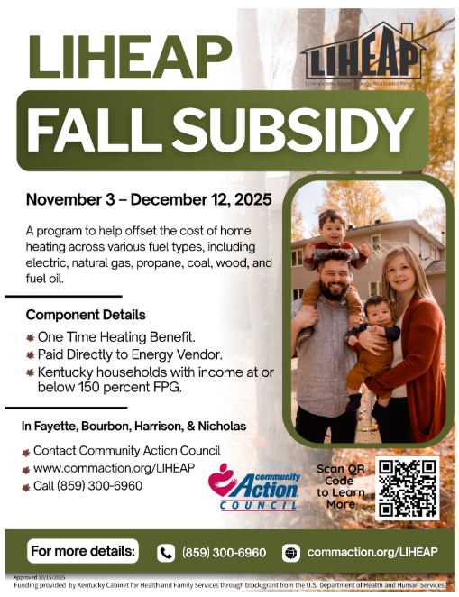 Kentucky’s LIHEAP (Low-Income Home Energy Assistance Program) is accepting applications January 7-March 15, 2025 on a first come, first served basis. Contact Community Action Council at 859-233-4600.